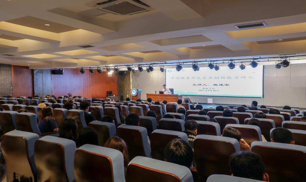 9月30日下午,我校特聘教授、中国教育审计学会会长、中国高等教育学会高等教育财经分会理事长、对外经贸大学原校长施建军教授应邀来校,在学校至善讲堂作题为《中国服务外包企业创新能力研究》的讲座报告。各二级学院领导以及来自经济与管理学院、商贸与法律学院及商务英语专业的200余名师生现场聆听了讲座。副校长杨庆庆主持当天活动。
