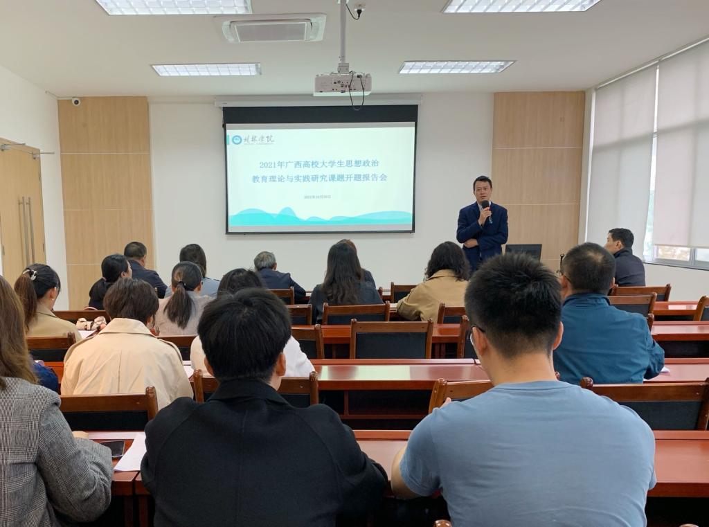 10月20日上午,我校2021年广西高校大学生思想政治教育理论与实践研究课题开题报告会在图书馆C馆三楼报告厅召开,首席教授周世中、韩明受邀出席,立项课题所在学院院长、教学科研副院长、青年助教代表等30余人参加了报告会,会议由教学科研处副处长肖立章主持。