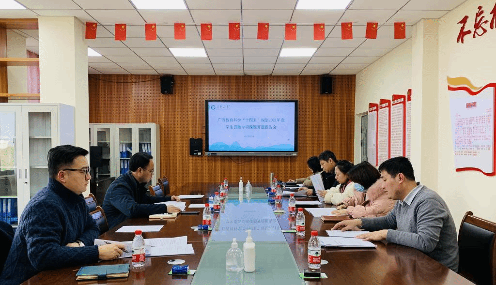 1月13日下午,我校广西教育科学规划2021年度学生资助专项课题开题报告会在知善楼8312会议室召开,学校党委副书记、副校长邓志平、商贸与法律学院书记陈俊杰受邀出席指导,课题组成员、教学科研处等10余人参加了报告会,会议由教学科研处副处长肖立章主持。