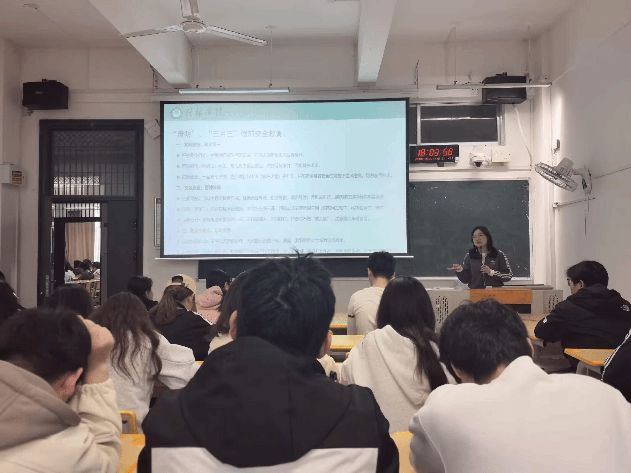 班会上,各年级辅导员围绕假期安全重点内容,结合真实案例展开详细讲解。交通安全方面,提醒学生出行选择正规交通工具,遵守交通规则,拒乘无牌无证、超载车辆;防火安全方面,针对清明祭扫特点,倡导文明祭扫,注意用火安全,并强调宿舍用电规范,严禁使用违章电器;人身财产安全方面,教育学生提高防骗、防盗意识,警惕电信网络诈骗,不轻信陌生信息、不随意转账汇款,外出尽量结伴而行,妥善保管个人财物;饮食安全方面,提醒注意食品卫生,预防食物中毒与肠胃疾病。