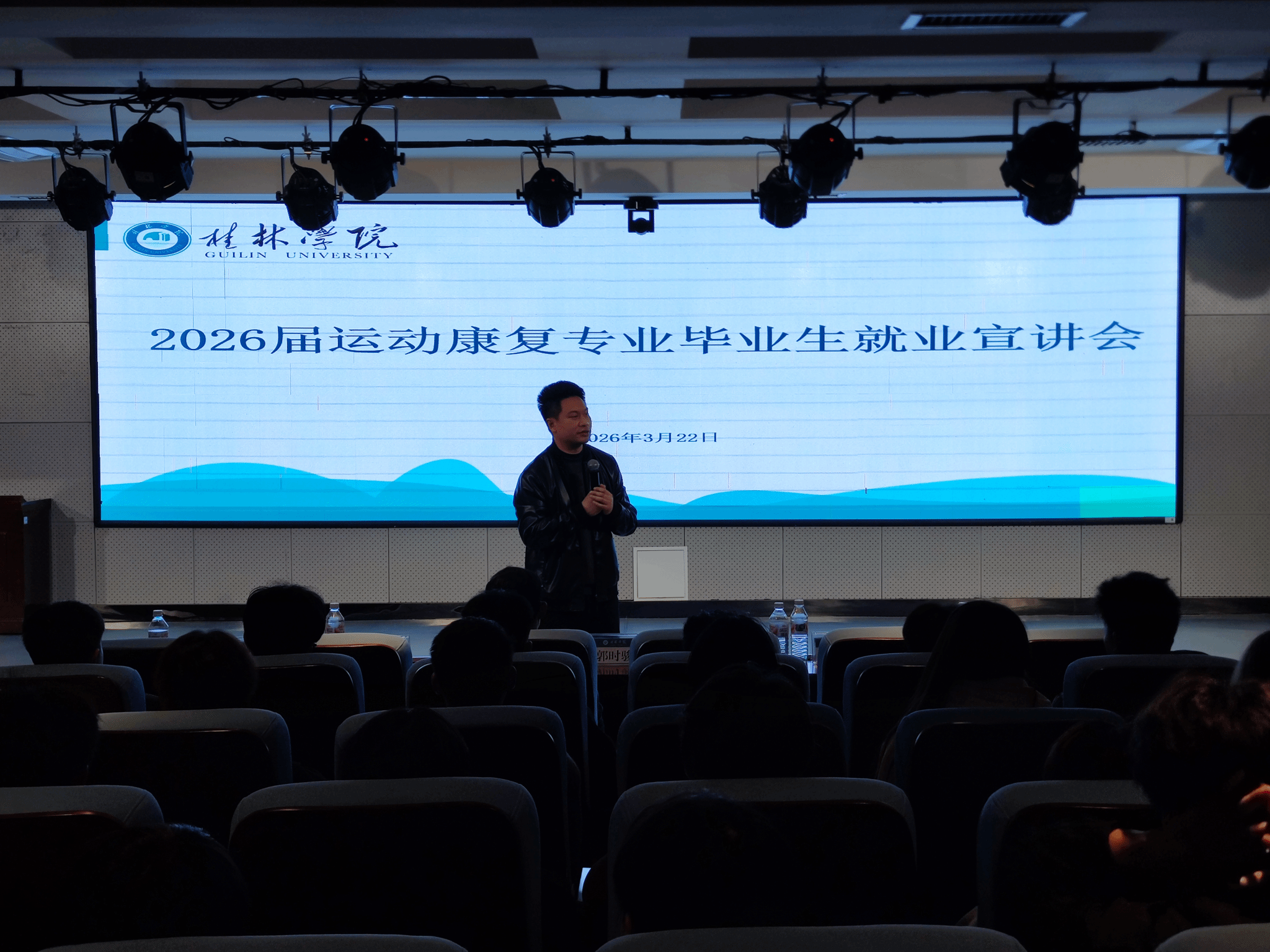 3月22日,桂林学院运动康复专业2026届毕业生招聘宣讲会在学校至善讲堂举行。本次宣讲会特邀长沙市青少年体医科研服务中心负责人罗洋担任主讲。学院党总支书记、运动康复专业教师及2022级运动康复专业全体学生参加活动。