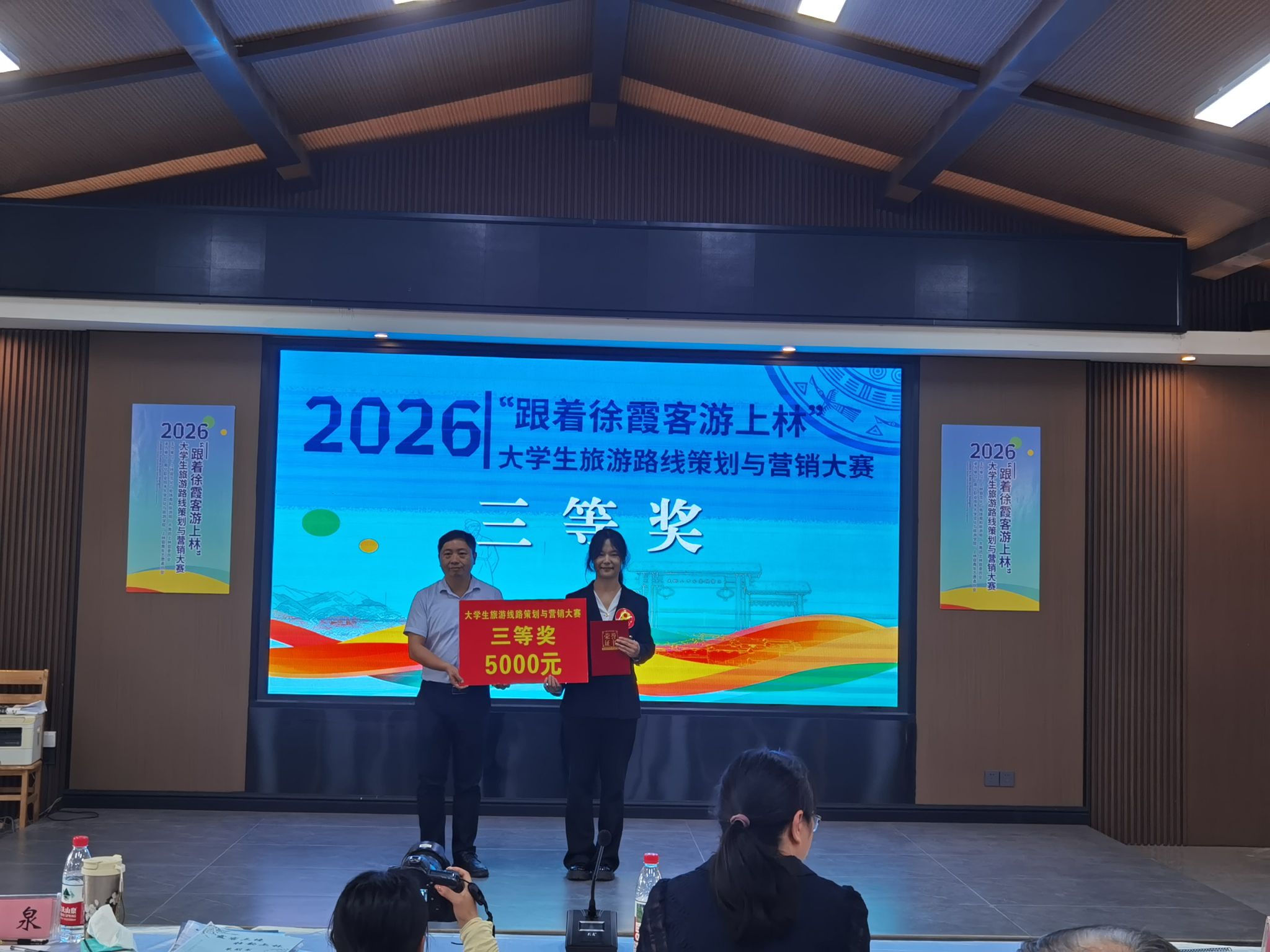 该项赛事自2026年3月启动以来,吸引了来自南宁、柳州、桂林、钦州、百色、梧州、贺州等7个城市、70多所广西高校的507支队伍、2000余名大学生踊跃参与。经过初审严格筛选,仅15支队伍晋级总决赛。决赛设置一等奖1名、二等奖1名、三等奖1名、优秀奖7名、风采奖5名,竞争异常激烈。我校学子在决赛路演中,凭借独特的线路创意、深厚的文化挖掘及专业的营销方案,通过现场陈述、作品展示与评委提问等环节,赢得高度认可,最终荣膺三等奖。