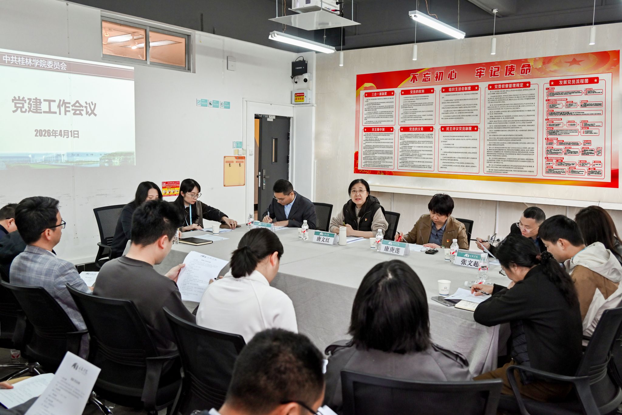 为持续巩固和提升党建“双创”工作建设成果,4月1日上午,我校在至善楼3207会议室召开党建工作会议。校党委书记唐文红出席并主持会议,校纪委书记康庚莲、各党总支书记、党委办公室、党委组织部、党委宣传部、党委统战部、党委教师工作部、党委学生工作部、纪委办公室、董事会秘书处负责人及结对共建广西师范大学挂职干部参加会议。