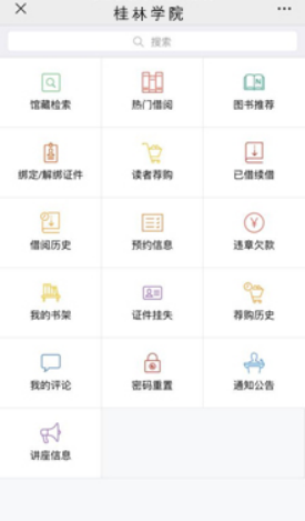 方法三:在手机上,关注桂林学院图书馆微信公众号,在页面中打开“服务门户” 中的“馆藏检索”。