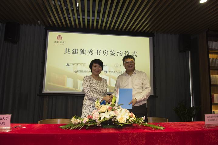 建“独秀书房”框架协议,双方就书房建设与运营、阅读文化品牌打造、出版资源提供、观文馆读书社建设等事宜进行了商定,广西师范大学出版社集团还将在我校教职科研人员学术著作出版、学生文化领域创新创业、校园作家项目计划实施等方面提供扶持。