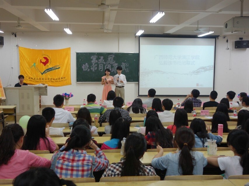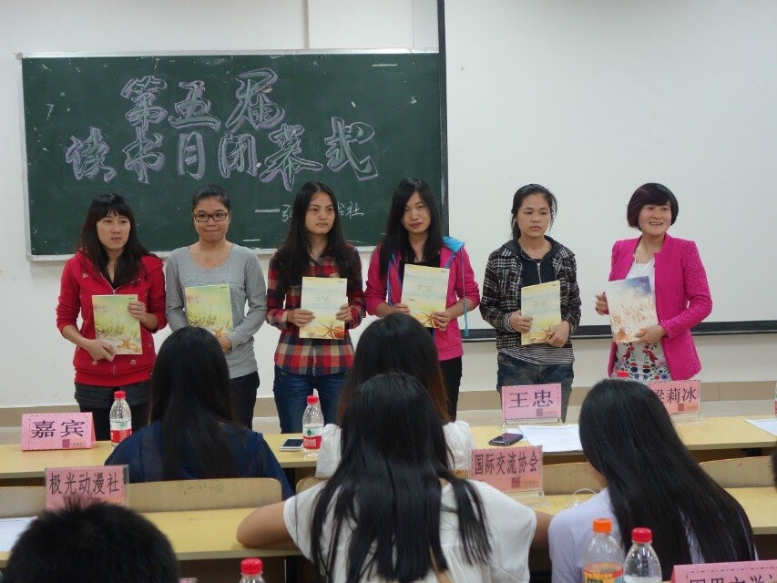 “旧书不厌百回读,熟读深知子自知”。为了对整个“读书月”活动进行回顾与总结,展示同学们的风采及颁奖,2014年5月16日晚19:30,弘毅读书社在1307教室举行了“慧友”第五届读书月颁奖晚会暨读书月闭幕式。参加本次活动的嘉宾有实验信息中心主任王老师,图书馆梁老师,因果文学社、兰亭书画社、篮球协会、心理协会等兄弟协会的代表,以及读书社会员、获奖人员等。