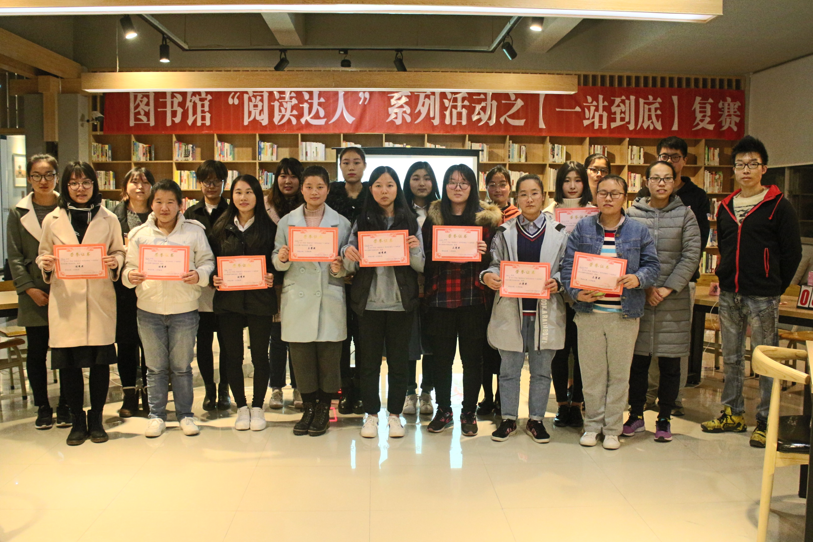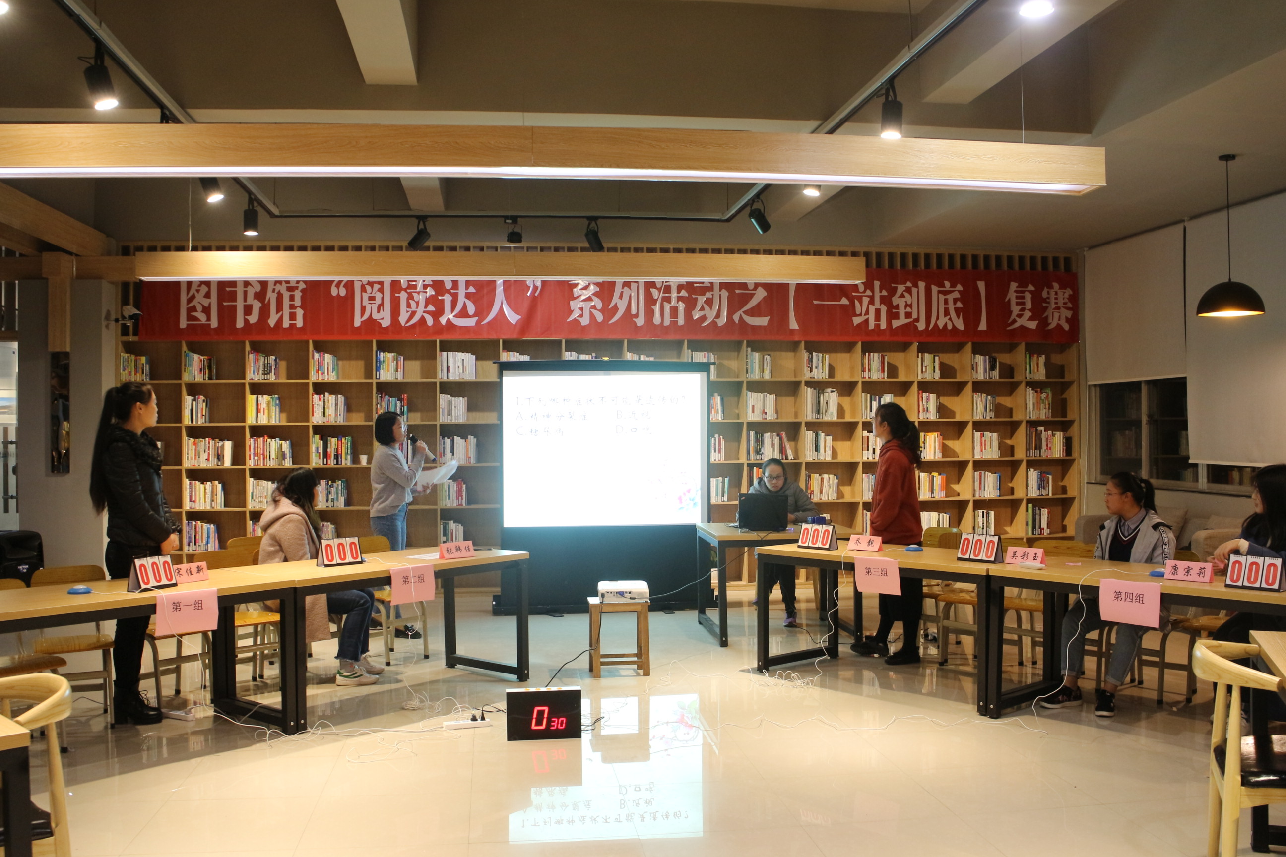 为了给广大同学提供展现自我才华的平台,图书馆11月底、12月初开展“一站到底”知识竞赛活动,共有60多名同学参与了比赛。经过第一轮的笔试答题初赛活动,20名选手晋级进入复赛阶段,12月11日晚图书馆组织晋级选手在图书馆多功能阅览室进行复赛,图书馆综合服务部老师和近100名学生到场观看比赛。