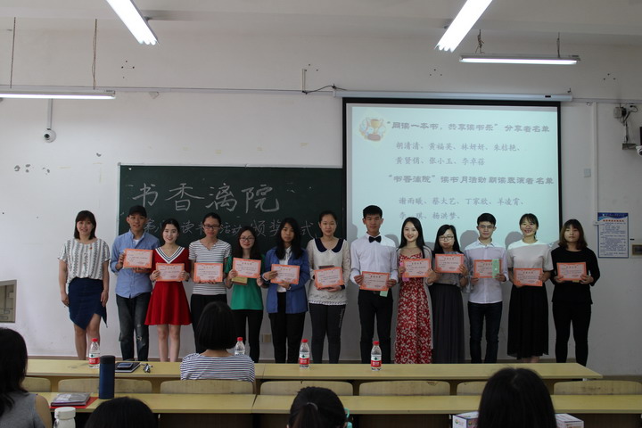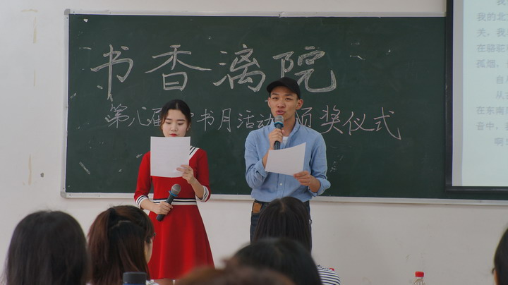 颁奖仪式上,首先播放了微视频比赛一等奖作品,随后主持人公布了本次读书月各项活动的获奖者名单并为获奖同学颁发荣誉证书和奖品。李琪,杨洪梦,蔡大艺等同学为颁奖仪式带来了精彩的朗读表演,用声音传递了文字的魅力。