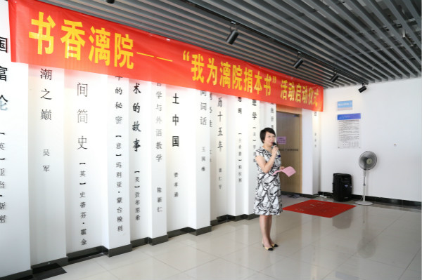杨庆庆副校长为活动致辞。她表示:学校图书馆建馆时间较短,馆藏图书还不能满足师生需求,因此,图书馆的发展还需要广大师生的共同努力,除了学校今后加大投入力度外,希望得到广大师生和校友一如既往的支持。如果师生们有闲置的图书,希望能捐赠到图书馆来,让更多的读者分享好书。同时希望图书馆将师生的赠书整理加工好,让这些图书早日与读者见面。