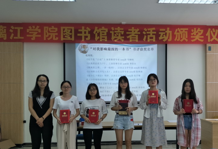 知识是人类进步的阶梯,阅读则是了解人生和获取知识的重要手段和最好途径。为了让更多的师生认识到阅读的重要性,参与到阅读的行列中,营造浓郁的书香氛围,图书馆于本学期开展了“书香漓院”第九届读书月系列活动,共计约600人次积极参与活动,部分同学表现优秀,获得表彰。6月15日下午,读书活动颁奖仪式在多功能阅览室报告厅举行,部分馆员及60余名同学参加了本次活动。