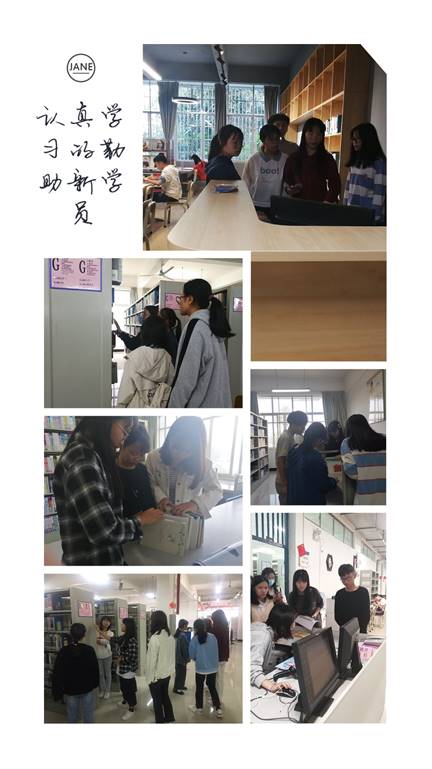 培训的第二个环节是“老带新”到各个馆区进行实地操作演练。有经验的“老”勤助学员带领新学员分组进行实操,老学员认真讲解:如何给图书分类排序、如何上架图书、如何调整书架的书籍摆放以及值班时的注意事项......新学员认真聆听,主动动手来操作,演练实际操作环节让新勤助学员更快的熟悉图书馆勤工助学的具体工作内容。