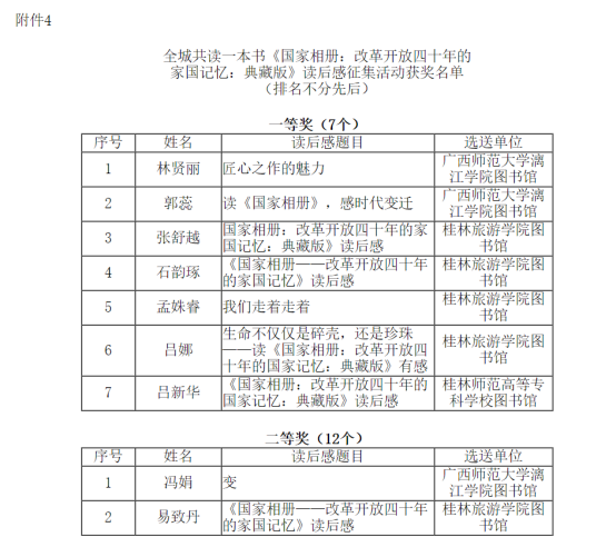 由桂林市图书馆学会组织开展的2020年“全城共读一本书——《国家相册:改革开放四十年的国家记忆:典藏版》及读后感征集活动结果近日公布,我校图书馆组织选送的语言文学学院林贤丽同学的读后感“匠心之作的魅力”,语言文学学院郭蕊同学的读后感“读《国家相册》,感时代变迁”等获本次征集活动一等奖,图书馆冯娟老师的读后感“变”获征集活动二等奖,朱晓蕊等3名同学的读后感获征集活动三等奖,于火兰等9名同学的读后感获征集活动优秀奖,我校图书馆在本次同城共读活动中获优秀组织奖。