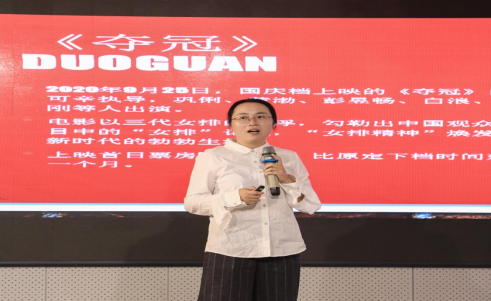 廖静老师以电影《夺冠》为例,从共同的叙事母题,身体与政治的关系,意识形态的影像化符码三方面,分析了我国体育题材电影主旋律的影像特征,还通过经典片段与师生分享影片中的女排精神,让师生一起领略中国特色社会主义文艺的独特风景,汲取并传递电影中的正能量。