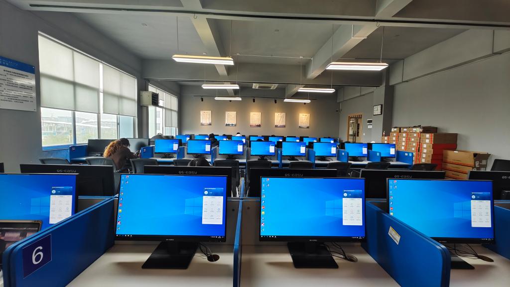 电子阅览室设在图书馆C馆区三楼,阅览环境清新,桌椅舒适,本次全新升级了54台云桌面计算机,将原有19寸显示器改换成了现在的23.8寸无边框显示器,通过云服务器的性能分配,其运行内存容量提升了4倍,整体运行速度及任务处理能力也比原有计算机有了显著的提升。