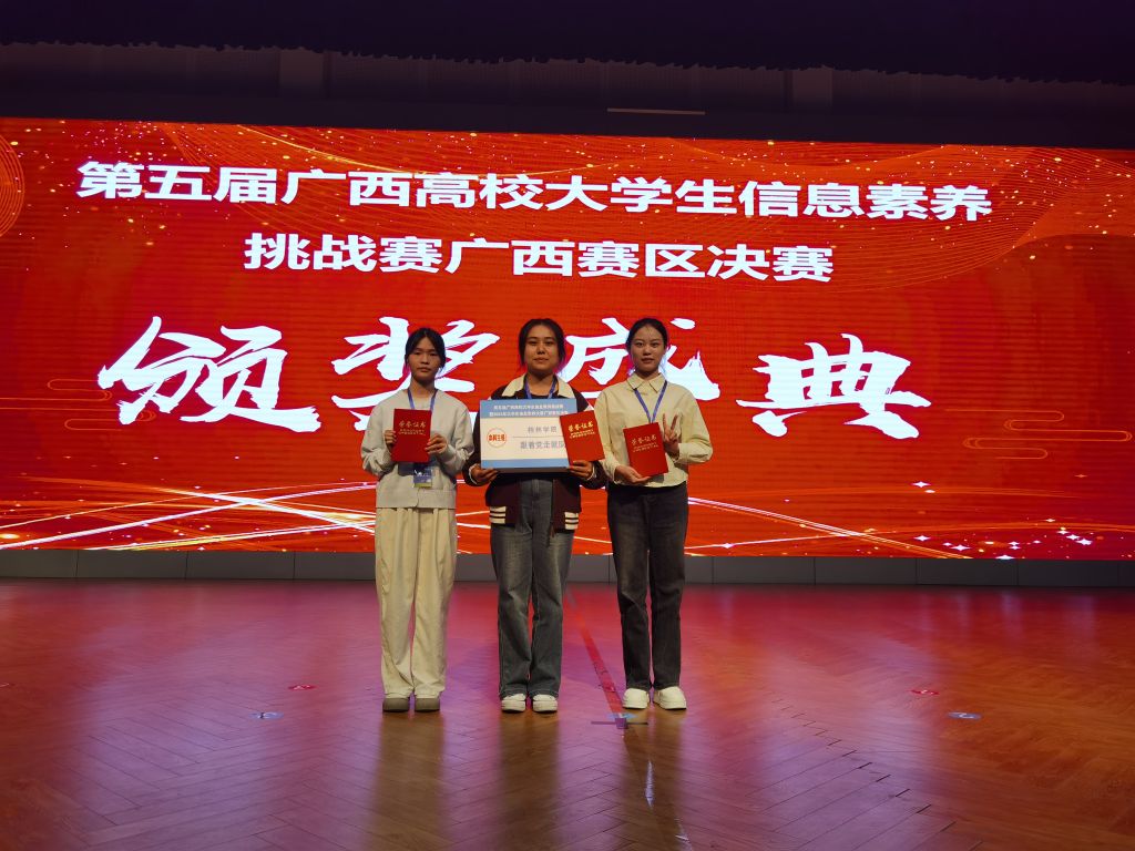 11月9日,第五届广西高校大学生信息素养挑战赛暨2024年大学生信息素养大赛决赛在桂林理工大学落下帷幕,来自金融与法律学院的吴梦霄、管理工程学院的覃靖敏、人文学院的马丽娜组成的团队在本次决赛中荣获团体二等奖。