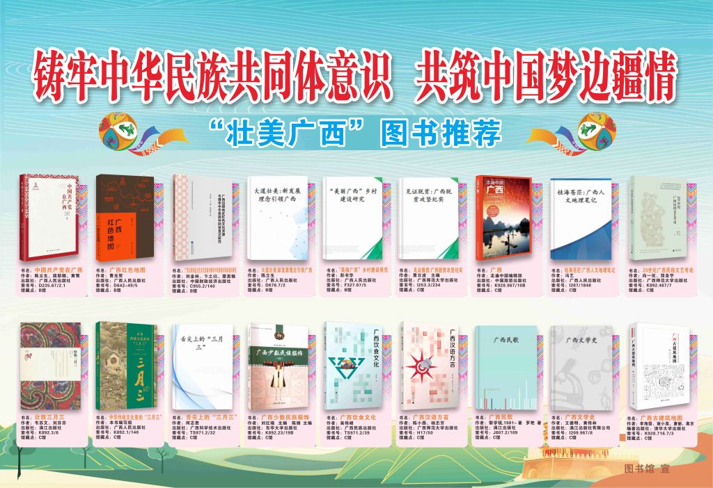 图书馆围绕“铸牢中华民族共同体意识,共筑中国梦边疆情”主题,在馆区宣传栏张贴“壮美广西”图书推荐海报,推荐与广西及“三月三”相关书籍,引导学校师生通过书籍认识广西,了解“广西三月三”。同时在图书馆C馆三楼布置“壮美广西”主题实体书展,内容涵盖广西政治、经济、地理、历史、语言、饮食、民歌、民族服饰和广西“三月三”文化等。此次书展共展示广西相关书籍60余册,内容丰富详实,可帮助读者全面了解广西概况。