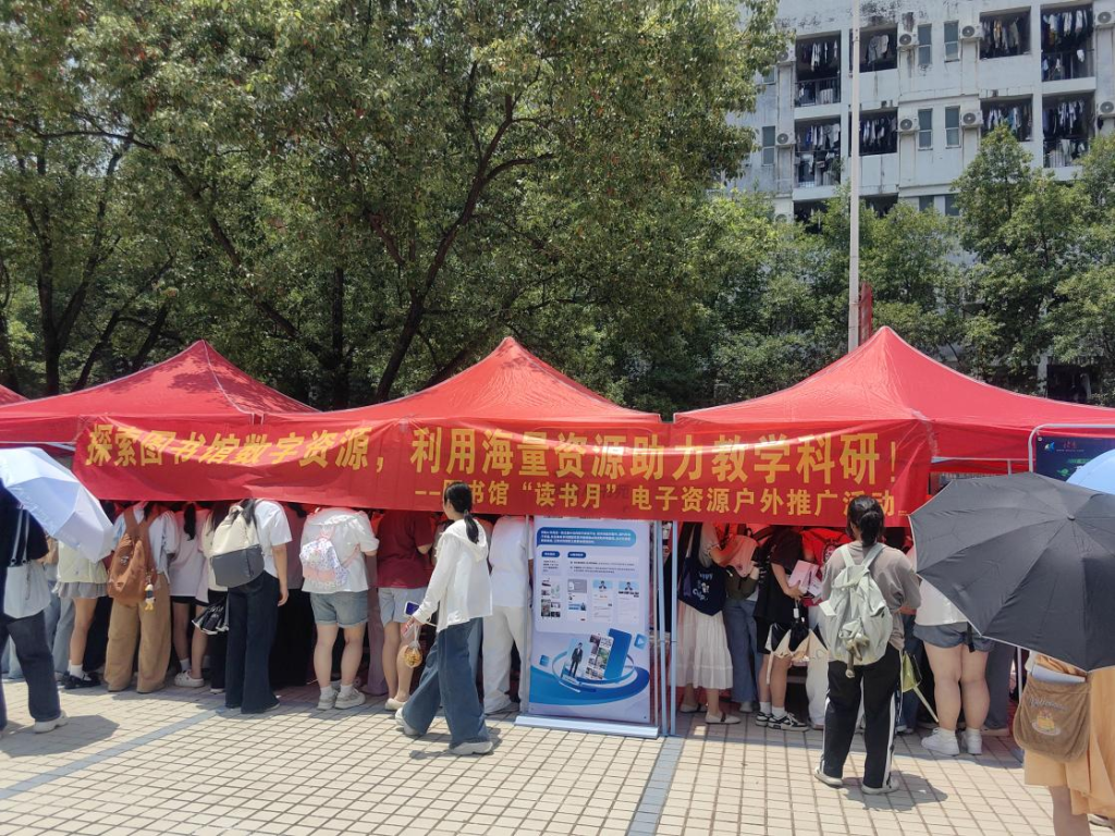 6 月 5 日上午,由图书馆主办的电子资源利用宣传推广活动在乐善广场火热开展,活动吸引了众多师生读者参加。