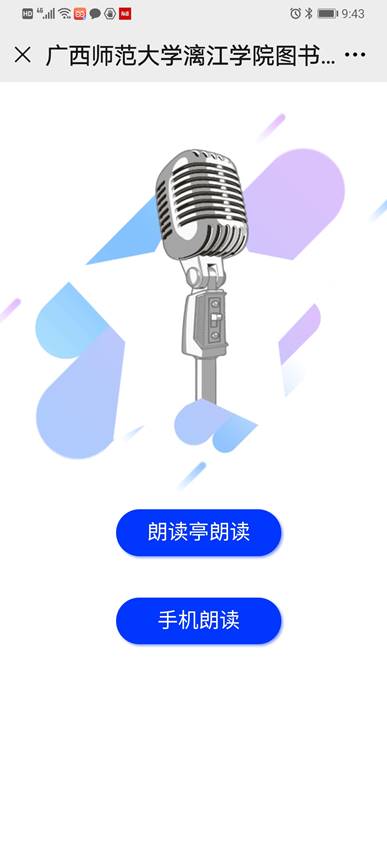 (2) 博看朗读小程序参赛:关注图书馆微信公众号,从底部菜单进入“资源信息”中的“在线朗读”博看朗读小程序,现在朗读亭参赛或手机朗读参赛。