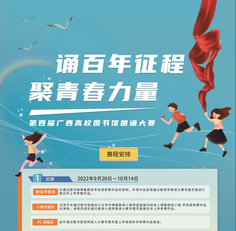 2022年是党的二十大召开之年,也是中国共产主义青年团成立 100 周年。为了深入学习贯彻习近平总书记致首届全民阅读大会贺信精神,做好新时代全民阅读工作,积极发挥全民阅读凝聚思想共识、激扬奋进力量的重要作用,引导在校大学生深刻感悟习近平新时代中国特色社会主义思想的真理力量和实践伟力。广西高教学会图书馆专业委员会、广西高校图书情报工作指导委员会决定举办第四届广西高校图书馆“诵百年征程 聚青春力量”朗诵大赛,引导在校大学生胸怀理想、奋斗拼搏,为实现第二个百年奋斗目标、实现中华民族伟大复兴的中国梦凝聚起强大的青春力量。