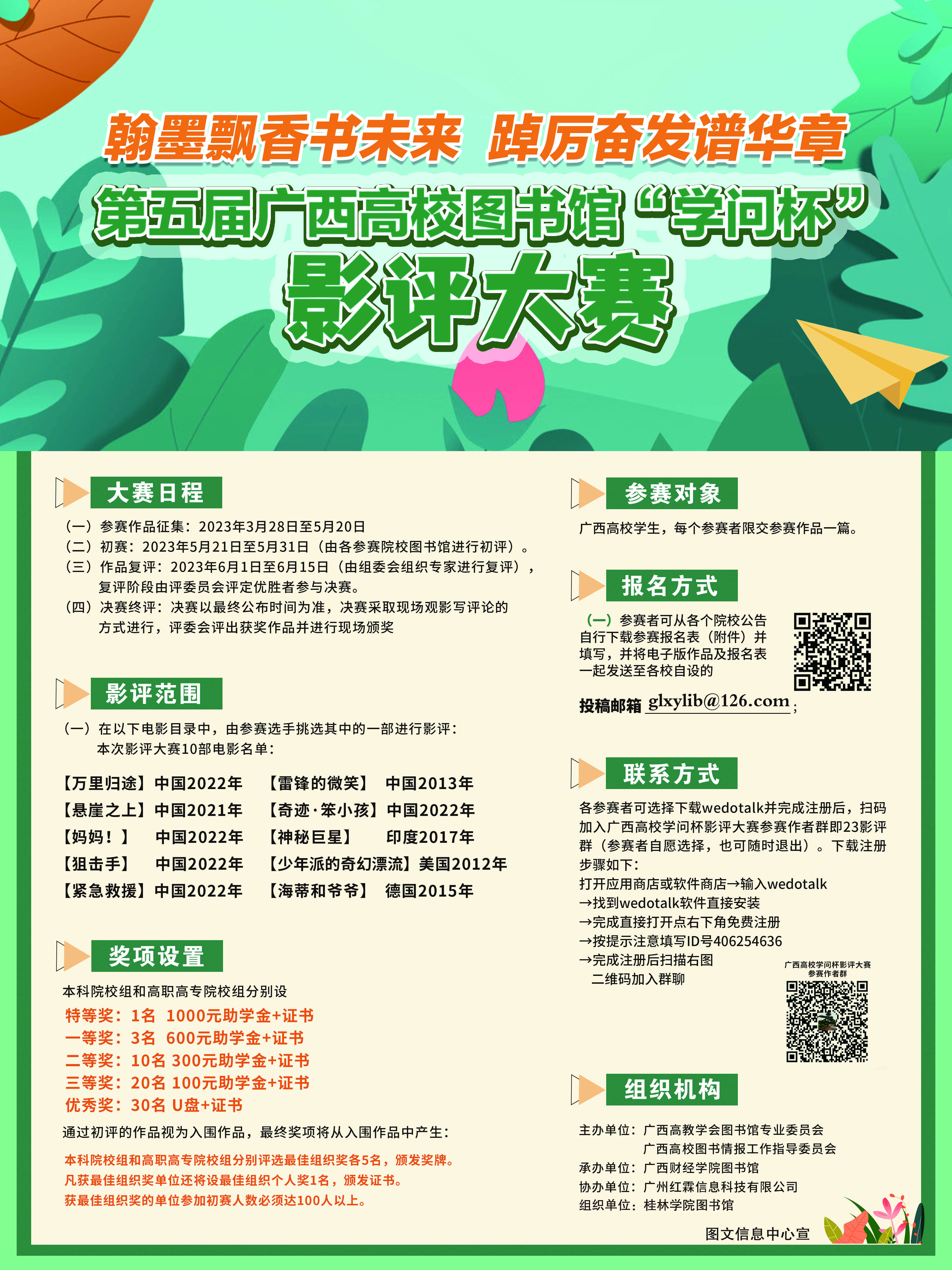 组织方式:根据《第五届广西高校图书馆“学问杯”影评大赛方案》(见附件)分级组织初赛和决赛。