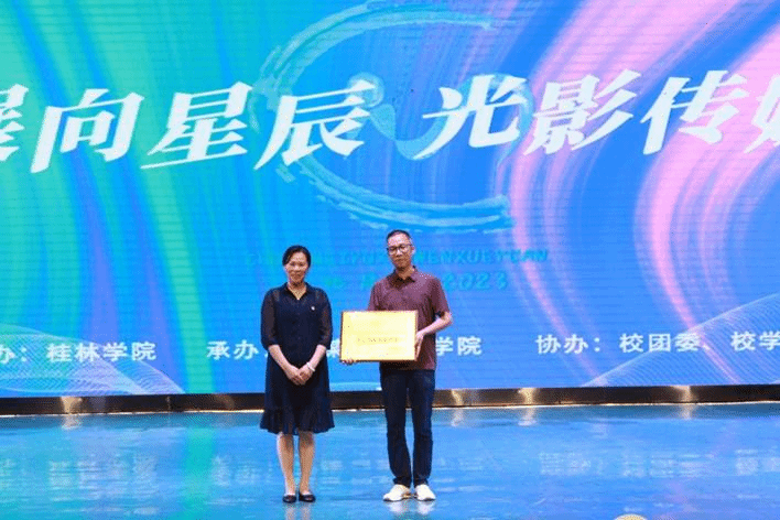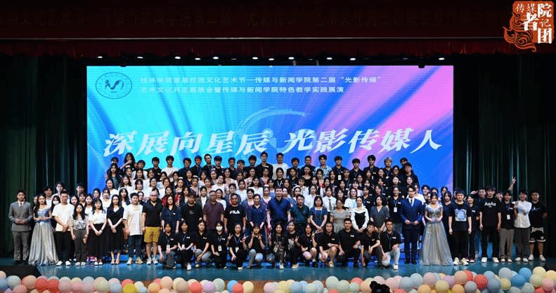 进一步推动校园文化建设,彰显青春奋斗底色,5月30日晚,传媒与新闻学院第二届“光影传媒”艺术文化月主题晚会暨传媒与新闻学院特色教学实践展演在弘善讲堂顺利开展。桂林学院副校长蒋毅、传媒与新闻学院院长钟毅、学院党总支书记翟彦、学校办公室副主任王德彬、传媒与新闻学院各教研室主任、校团委老师及师生代表等近500人观看了本次展演。