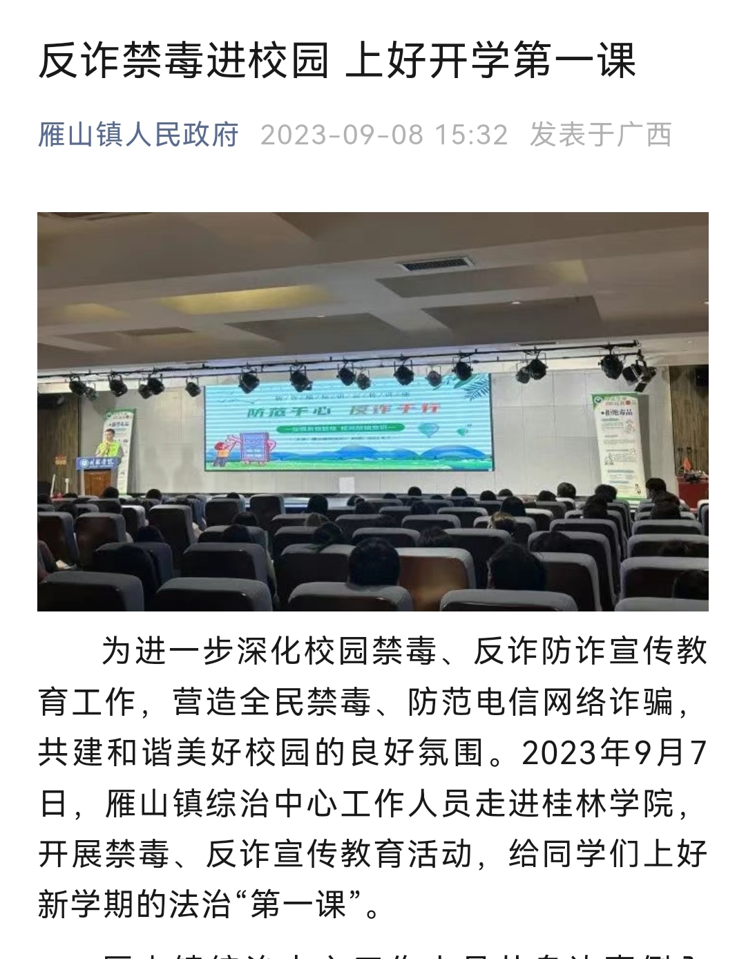为进一步扩大反诈宣传覆盖面,增强同学们的法制观念,预防和减少校园电信诈骗案件的发生, 9月7日上午,传媒与新闻学院在至善讲堂开展主题为“防范于心 反诈于行”的法治宣传讲座,本次讲座由雁山镇社区禁毒工作站的社工熊永泉主讲。传媒与新闻学院党总支副书记李晓蕾、2023级新生辅导员陈虹出席了本次讲座,2023级数字媒体技术、新闻传播学类专业全体新生参加了本次讲座。