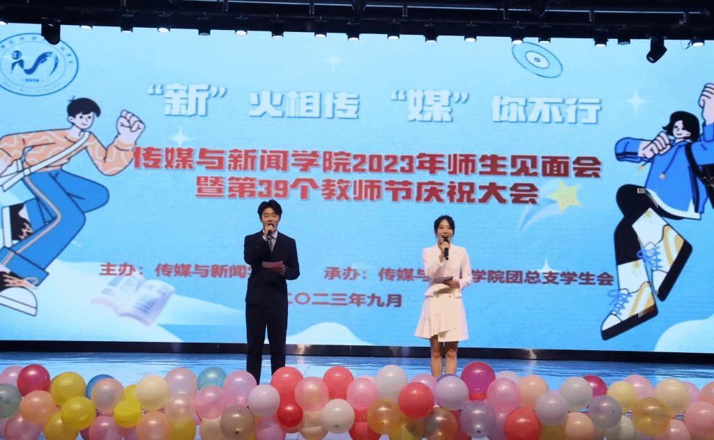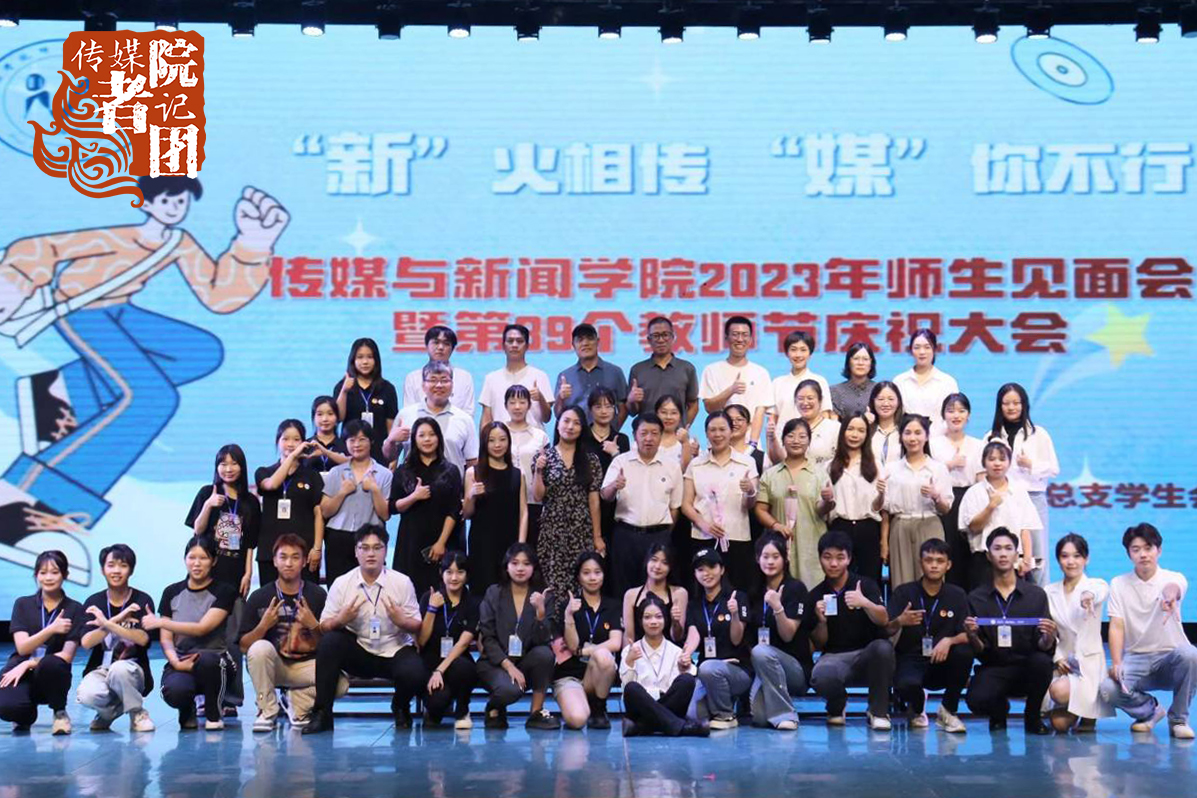 9月10日下午,传媒与新闻学院以“‘新’火相传,‘媒’你不行”为主题,在弘善讲堂举办了2023年师生见面会暨第39个教师节庆祝大会。学生事务处(部)副部长刘雪应邀参加,传媒与新闻学院全体教职工和288名2023级新生参加大会。大会还以直播方式邀请家长“云”相见。