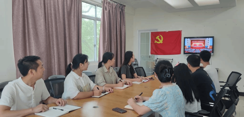 学院班子成员与行政教辅、辅导员团队在会议室集中观看学习