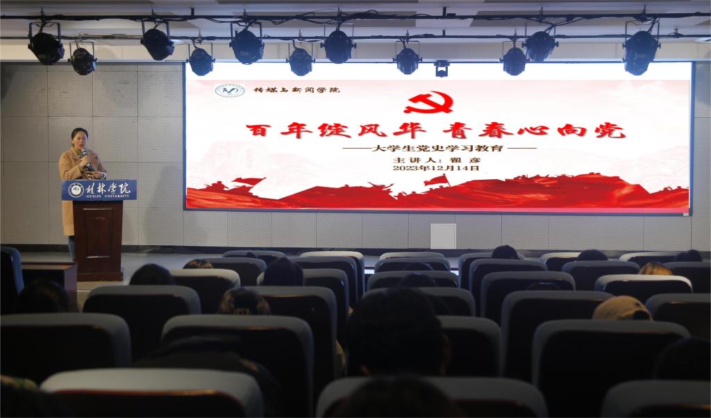 12月14日,传媒与新闻学院在至善讲堂开展“党课开讲啦”之党史学习教育暨新生入党启蒙教育主题党课。学院党总支书记翟彦以《百年绽风华 青春心向党》为题分两场给2023级全体新生讲授党课。党总支副书记李晓蕾、2023级新生辅导员以及2023级全体学生参加了此次讲座。