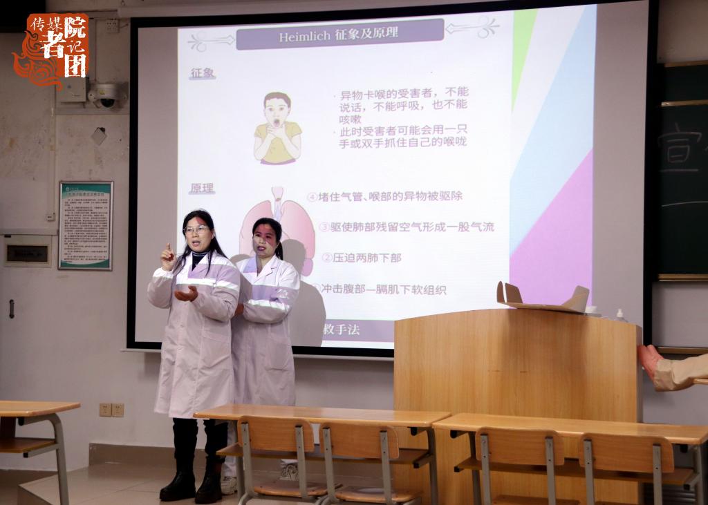 活动伊始,两位医生指明了心肺复苏包括判断患者生命体征、用力快速胸外按压30次、人工呼吸两次三个具体步骤,进一步阐述AED的含义及其操作技巧。随后两位医生又对海姆立克急救法的具体操作方法加以展示。理论教学结束,王丽媛医生拿出假人,对现场的同学们展开了心肺复苏法的实践教学。在医生的耐心指导下,宁业臻、梁琪琪、杨一冰等同学成功完成了心肺复苏的任务。获得同学们的热烈掌声。