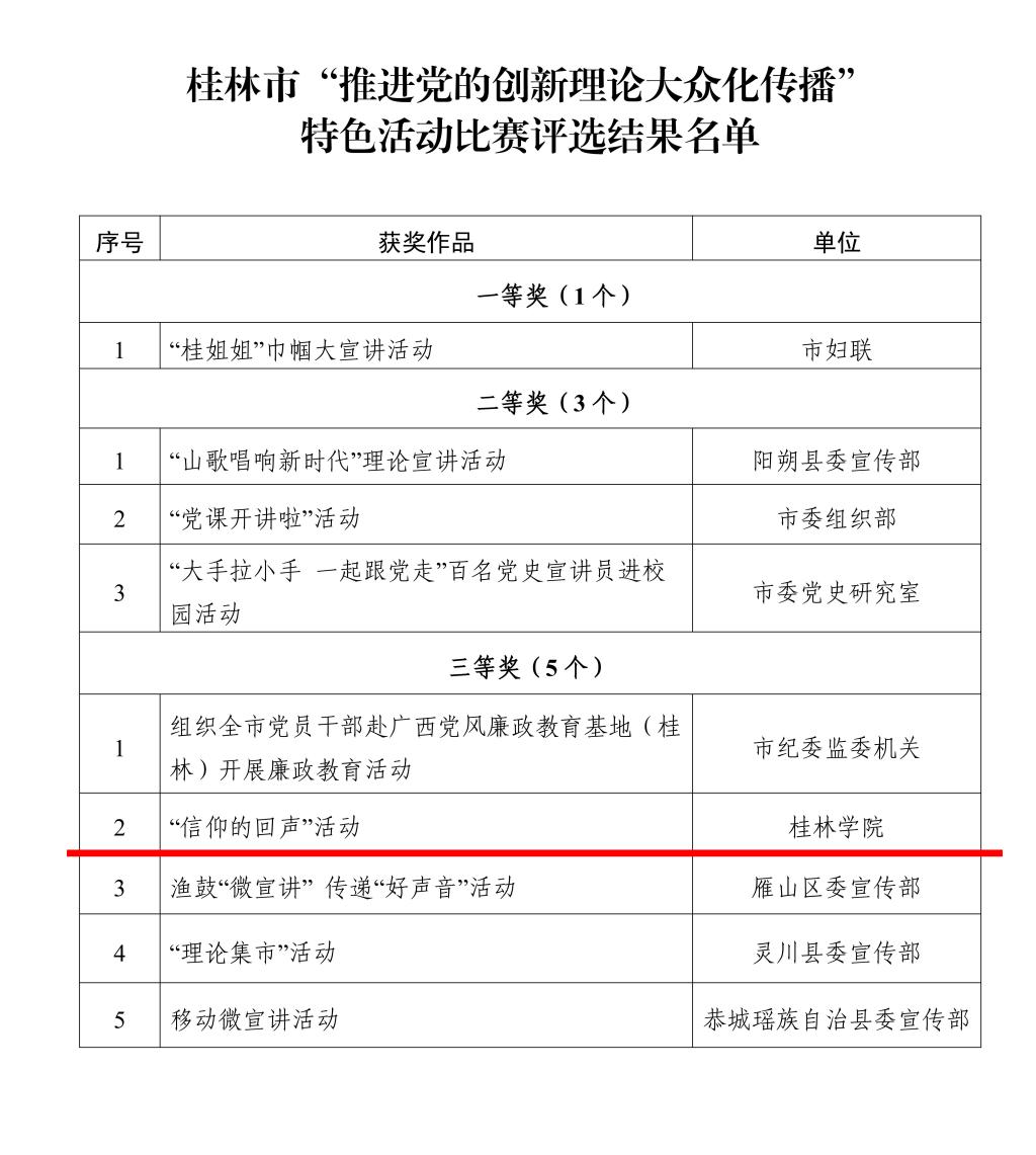 近日,中共桂林市委宣传部公布了2023 年度桂林市推进党的创新理论大众化传播系列活动评选结果,传媒与新闻学院活动品牌“信仰的回声”获桂林市“推进党的创新理论大众化传播”特色活动比赛三等奖。
