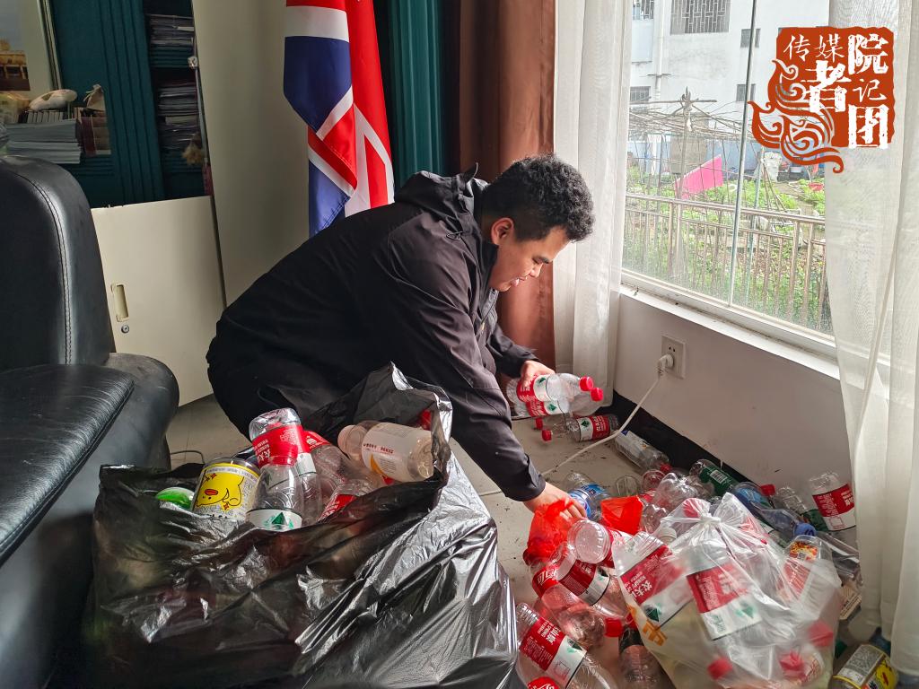 学生社区党支部成员黄镇坤同学收集废弃塑料瓶