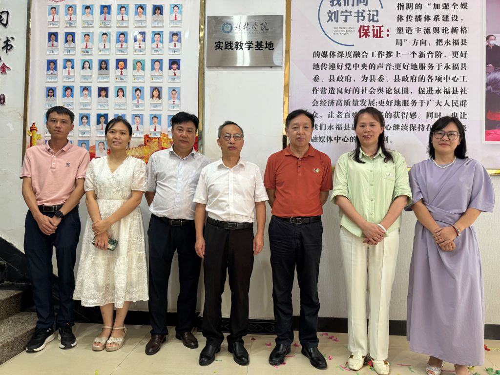 6月28日上午,传媒与新闻学院与永福县融媒体中心实践教学基地揭牌仪式在永福县融媒体中心举行。永福县人大常务委员会副主任曾宪辉、融媒体中心主任龚然辉、传媒与新闻学院院长钟毅、党总支书记翟彦共同完成揭牌仪式。传媒与新闻学院广播电视编导专业教研室主任陈璐,永福融媒体中心副主任唐影宸,学院辅导员陈虹、王佳雨、曹依婷参加此次揭牌仪式。