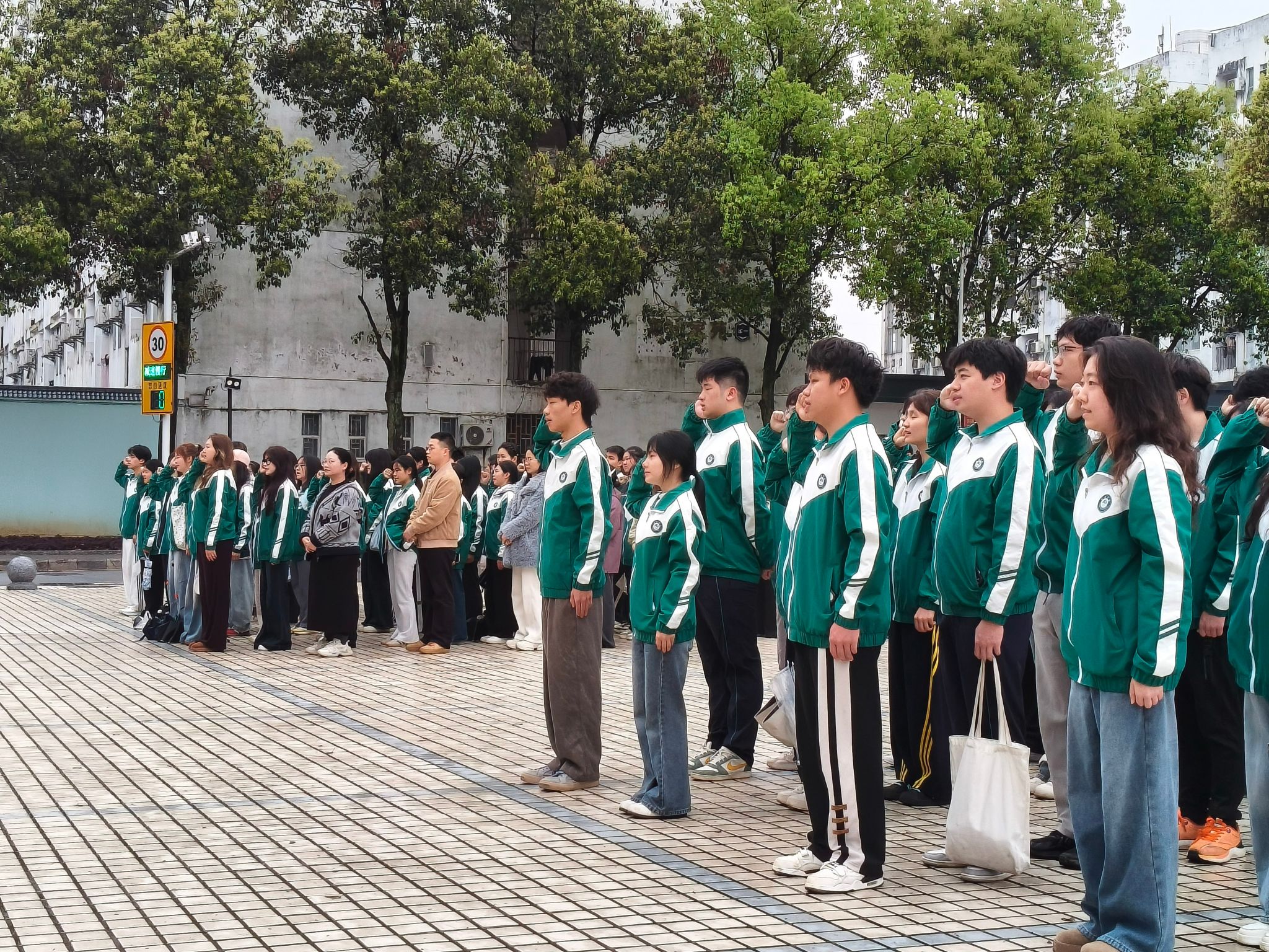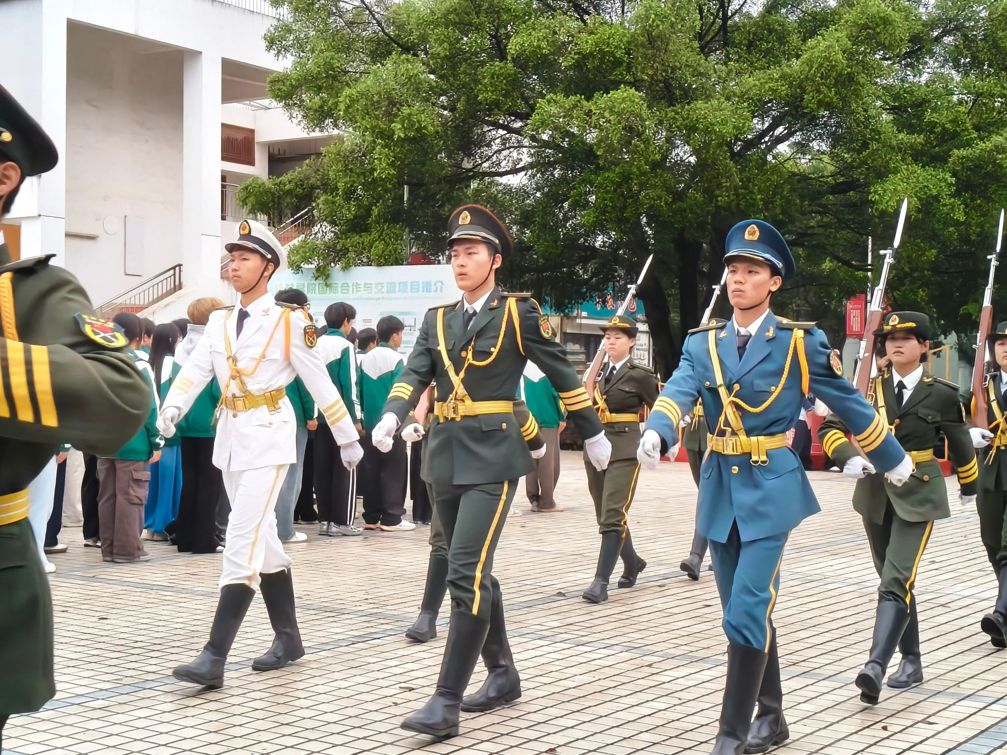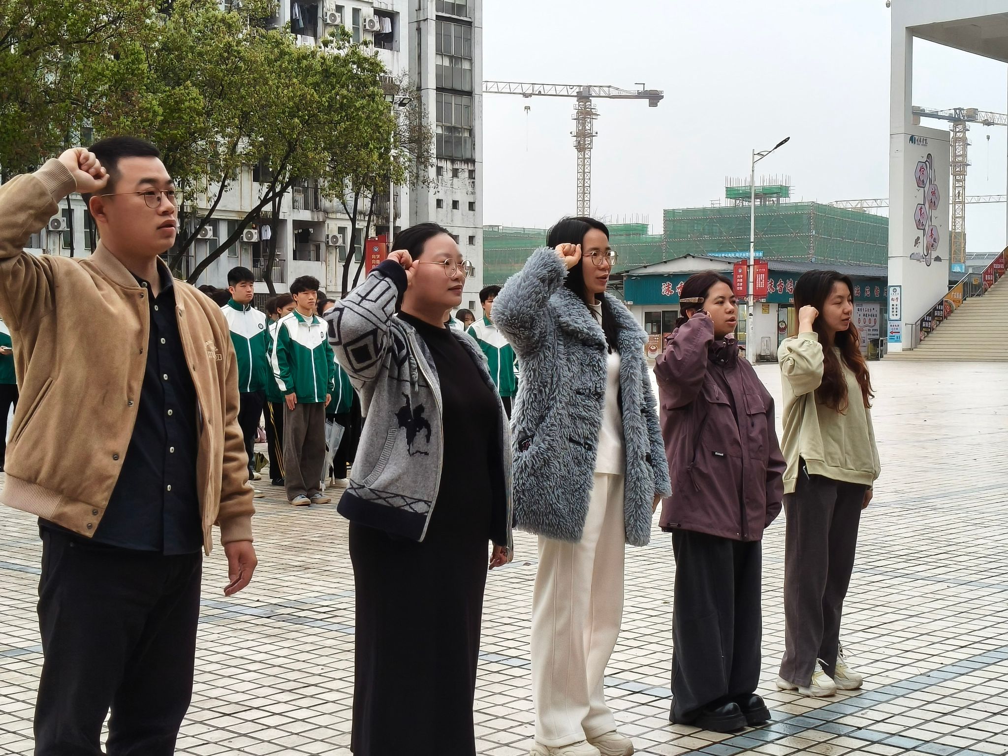 国旗护卫队迈着整齐的步伐护送国旗入场,全体师生面向国旗肃立行注目礼,在雄壮的国歌声中,五星红旗冉冉升起,爱国情怀与师者初心在师生心中激荡。