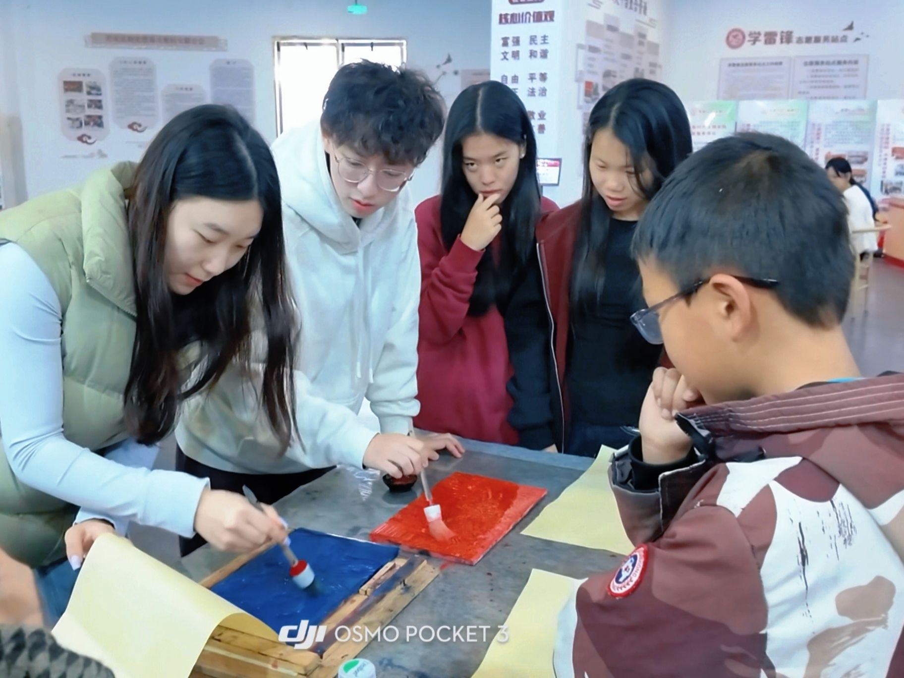 学生现场参与非遗拓片传承活动、非遗套色版画活动、渠工巧筑科普活动