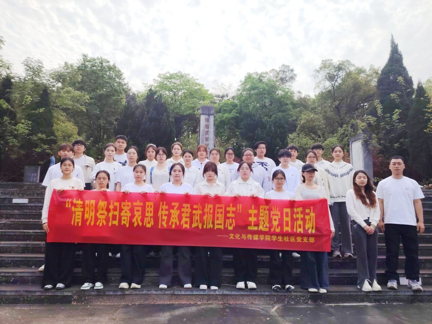 清明时节,追思悠悠。为缅怀先贤功绩,传承红色基因,弘扬爱国主义精神,4月1日下午,文化与传媒学院学生社区党支部组织全体党员及入党积极分子代表,前往马君武墓园,开展“清明祭扫寄哀思,传承君武报国志”主题活动。活动通过庄重的祭扫仪式和生动的微党课,引导广大党员铭记先辈遗志,汲取奋进力量。