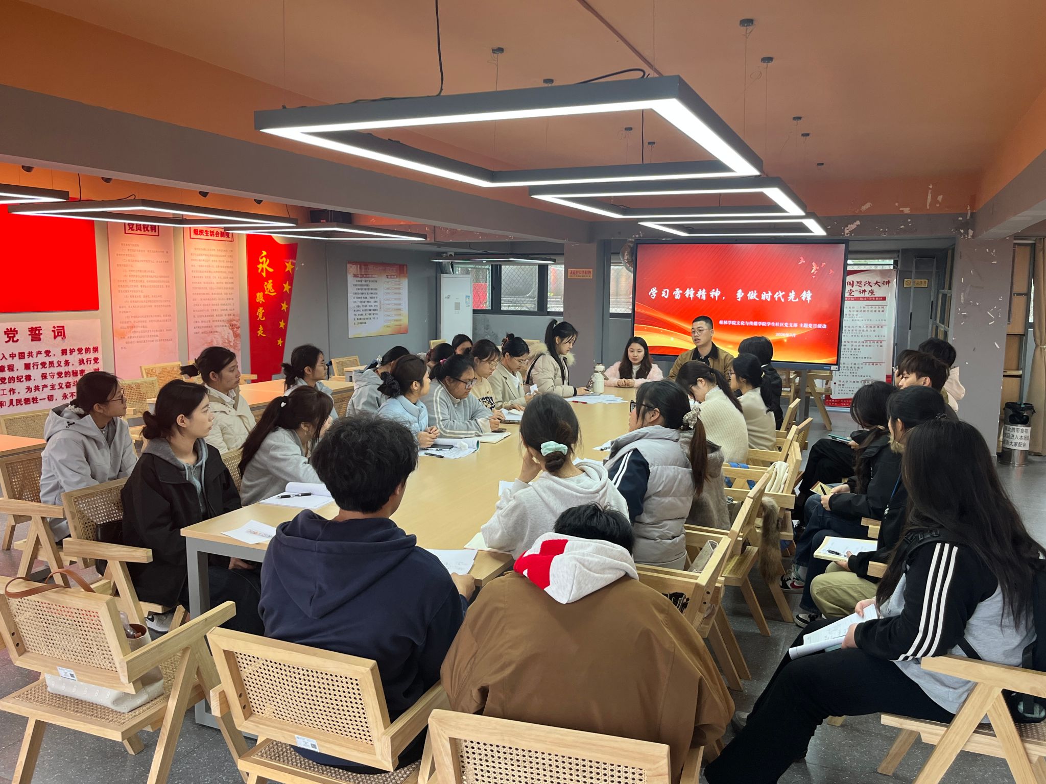 三月春晖映初心,雷锋精神永传承。3月18日下午,文化与传媒学院学生社区党支部在杉湖家苑“一站式”学生社区党团活动中心开展“学习雷锋精神,争做时代先锋”主题党日活动,通过理论学习与互动实践相结合的方式,引导全体党员深学细悟、躬身力行。
