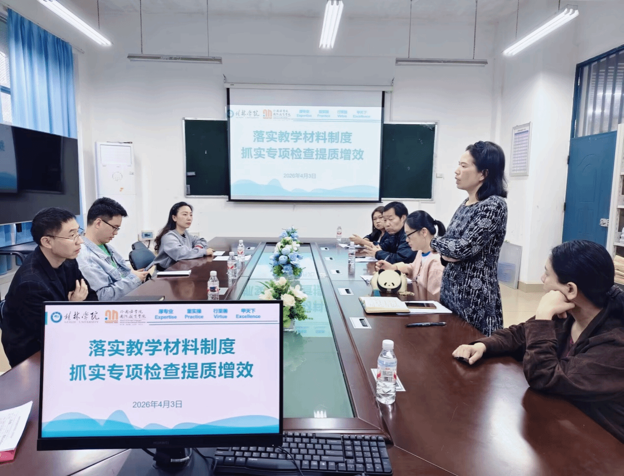 为深入落实学校教学材料管理制度,强化教学质量监控,夯实人才培养基础,助力学校本科教学评估工作,4月3日,泰语言文化教研室在2108会议室召开基层教学组织研讨活动,围绕“落实教学材料制度,抓实专项检查提质增效”主题展开深入交流。学院领导班子出席会议,教研室全体教师参与研讨,会议由教研室主任主持。