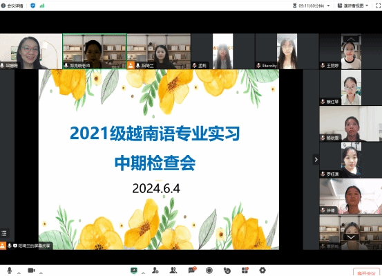 为了了解学生实习情况,规范实习过程,保证实习质量,6月4日,人文学院开展2021级越南语专业实习中期检查,正在越南实习的2021级越南语专业全体学生及校内实习指导老师通过腾讯会议的形式参加了会议。