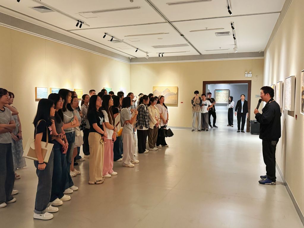 在桂林美术馆,学生们聆听了美术馆专家吴老师的精彩讲解。吴老师以其深厚的艺术底蕴,向学生们介绍了美术馆内收藏的当代艺术作品,这些作品生动展现了广西的发展面貌与独特文化。在吴老师的引领下,学生们得以更深入地理解艺术作品的内涵与价值。随后,在课程授课教师钟老师的组织下,学生们围绕这些反映广西发展的美术作品进行了深入的研讨,进一步提升了自身的艺术鉴赏能力和文化素养。