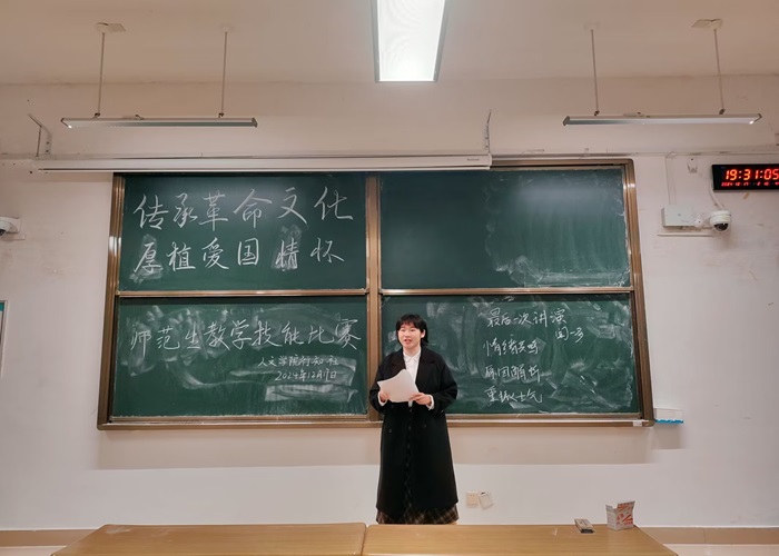 为大力弘扬教育家精神,提升汉语言文学专业学生的职业素养和教育教学综合能力,促进《语文课程与教学论》课程思政示范课程建设,12月17日晚,人文学院2024年汉语言文学专业教学技能比赛顺利进行。本次活动由语文教师教育教研室主办、行知社承办,语文教师教育教研室陈霞、曾强、朱秀群3位老师担任评委。