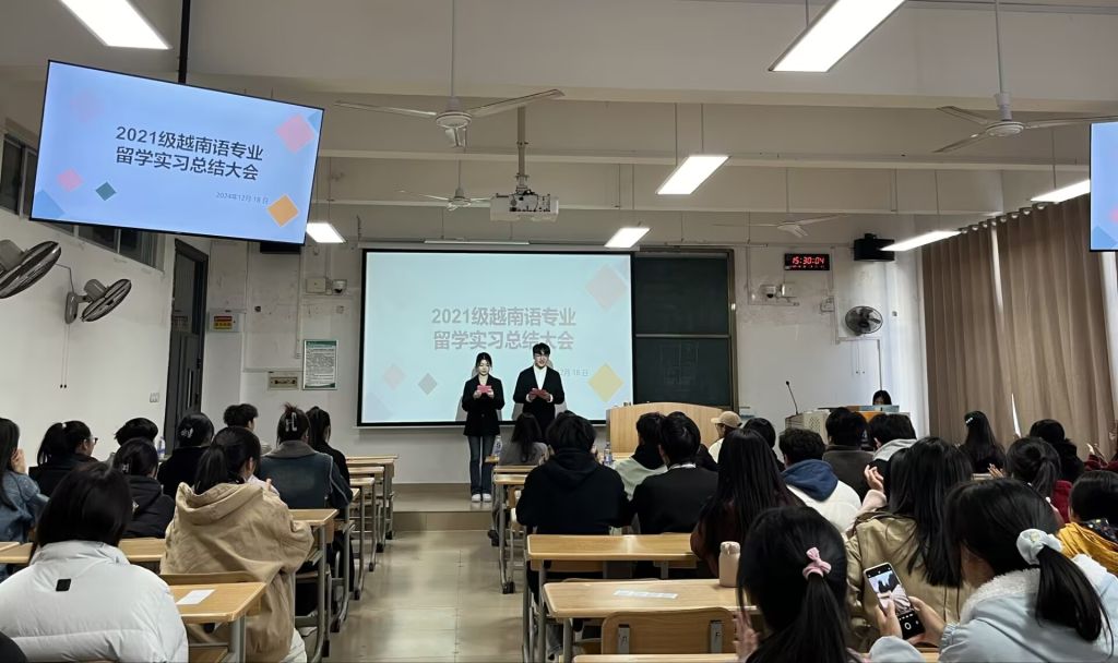 12月18日下午,人文学院2021级越南语专业留学实习总结大会于1210教室举行。发展与质量评估处副处长,越南语言文化教研室全体教师,2021级越南语专业辅导员以及2021级、2023级、2024级越南语专业全体同学参加会议。