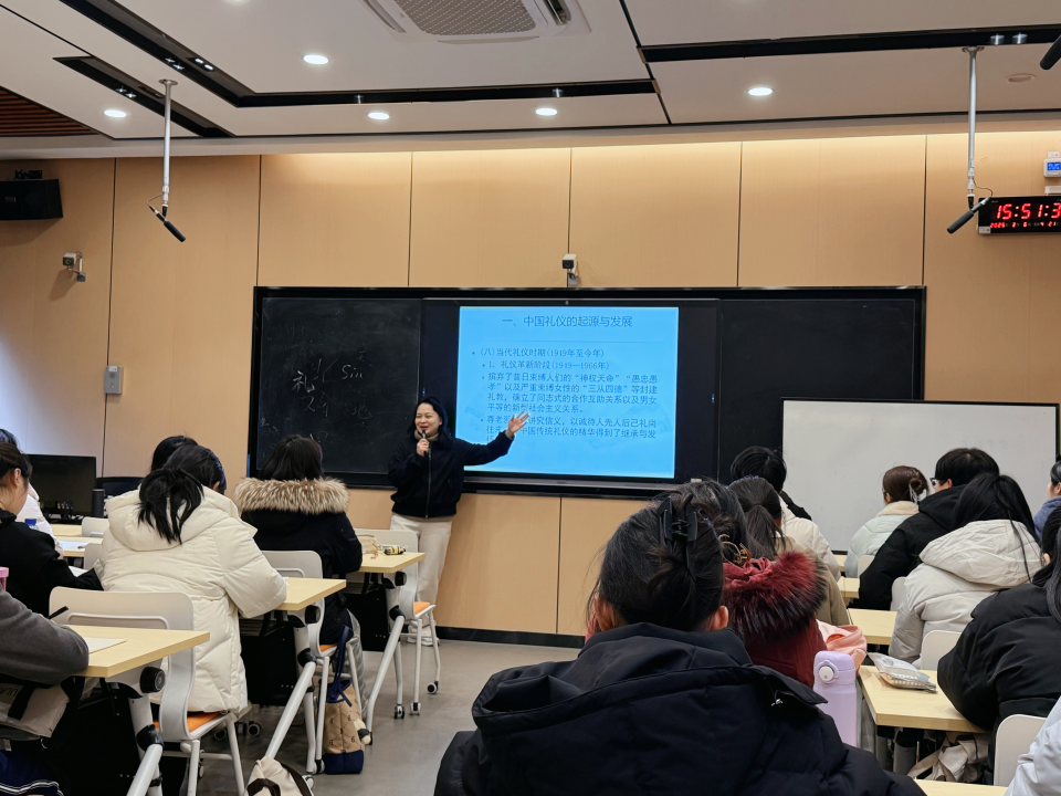 会议第一阶段,教研室成员在2203教室观摩刘浈老师主讲的《社交与礼仪》课程。授课教师采用情景模拟与案例分析相结合的教学方法,系统讲解了社交礼仪的核心概念与实践应用。课程设置小组讨论环节,通过师生问答形式完成知识要点解析,教学流程完整规范。