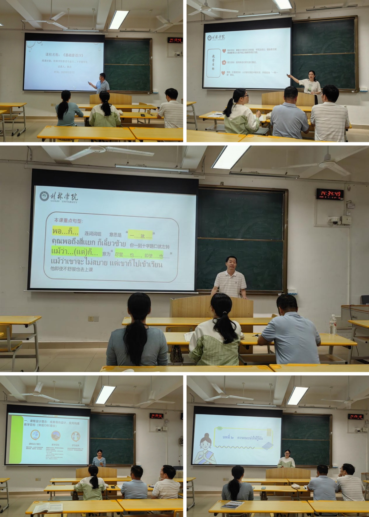 从泰语颤音“ร”的发音技巧到长句语法的逻辑拆解,泰语专业的老师们对着教材逐字标注,在备课笔记上写满批注。为一个文化典故查阅十几篇文献,只为在课堂上用最生动的案例诠释“萨瓦迪卡”背后的礼仪哲学。磨课是思维的碰撞与火花的迸发,是课堂创新。在1416教室里,老师们依次上台说课,有老师将泰剧片段融入语法讲解,让学生在剧情中感知语境;有老师设计“泰语角情景剧”,让学生在角色扮演中自然输出;还有老师结合“一带一路”背景,引入泰国商务案例,让语言学习与实践接轨。