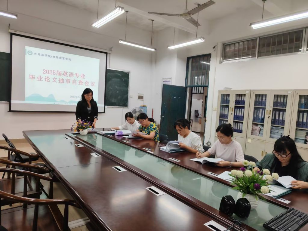 为进一步加强英语专业毕业论文质量管理,提升人才培养质量,学院于5月14日下午在2108会议室召开2025届英语专业毕业论文抽审自查会议。本次会议由英语语言文化教研室主任黄彦立主持,英语专业负责人陆巧华及部分骨干教师出席。
