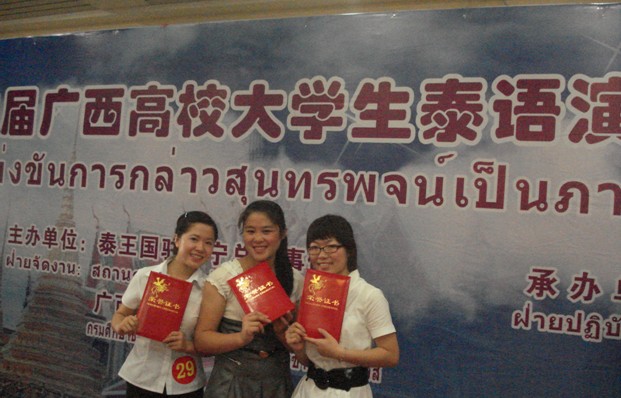 我院选派的08级泰语专业的三名参赛选手:秦润梅(左)、韦秋菊(中)、吴光怡(右)