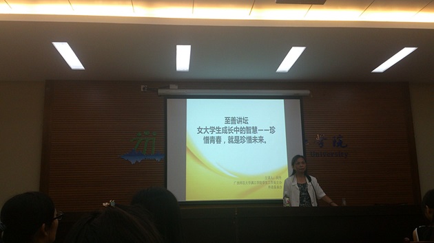 我院“至善讲坛”迎来专门为女大学生准备的知识讲座。5月22日晚,在3301教室开展了关于“女大学生如何展望未来与认知自己”的讲座,本次讲座的主讲嘉宾是广西师范大学文学院向丹副教授。讲座由我院学生工作处主办,外语系承办,秦丽芸老师担任主持,各系的女生代表参加了此次讲座。