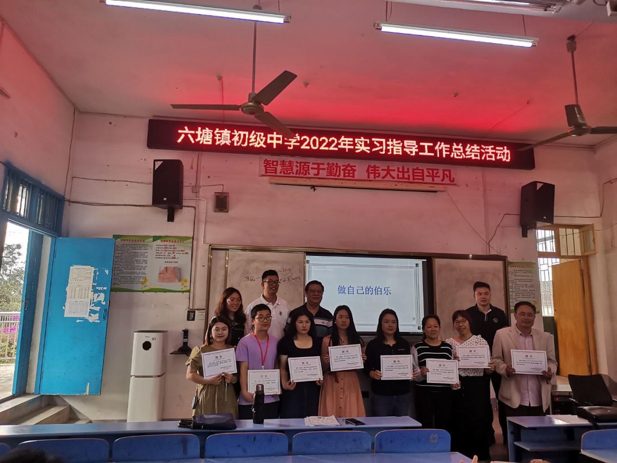 评课结束后,潘冠海教授和赵荣新副教授为六塘镇初级中学的指导老师、班主任颁发证书,以此表达他们两个多月来对我院实习生的指导和帮助。最后所有在场人员合影留念,本次活动圆满结束。