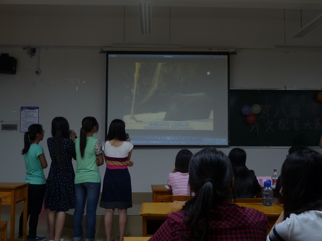 5月7日晚,第八届“外语文化月”之子项目——“外文配音比赛”在1502教室举行。配音比赛的选手既有外语专业的同学,也有来自非外语专业的同学,他们都充满对外语配音的喜爱,以高涨的热情参与到激烈的角逐当中。在比赛中,参赛选手为大家带来了电影《马达加斯加》、《西雅图夜未眠》,美剧《新成长烦恼》、泰国电影《女大十八变》等一系列风格各异的配音作品。场上的同学们用声音诠释影片中人物的喜怒哀乐、剧情的跌宕起伏,场下的同学们则尽情享受着各类配音带来的乐趣。而另一边,评委们则一丝不苟地考量着各组选手的综合表现。