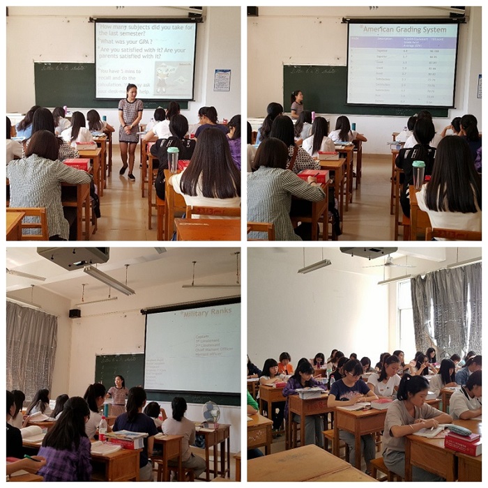 公开课的主题是“Letter to a B student”,易林霏老师从标题 “B student” 着手,结合《英语报刊选读》课程中对于英美国家学习评价机制相关新闻背景知识,以提问方式引导学生对文章标题理解的讨论,通过知识再现以及学生们实际学分情况,参考中美学习评价体制对比,学生们对自己的成绩评价所处等级有深刻的理解。
